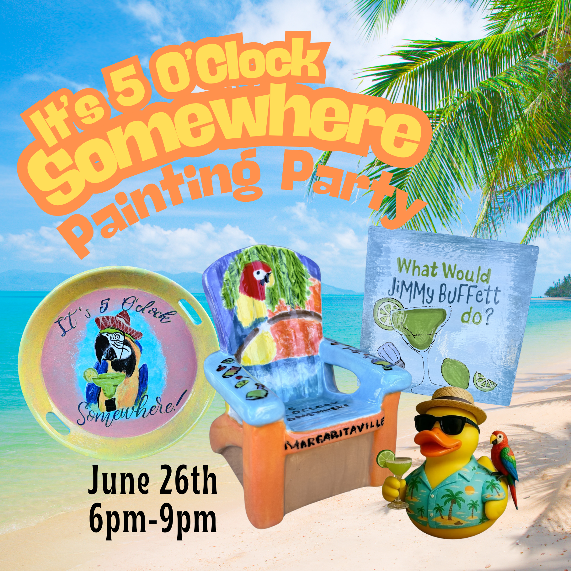 Be a parrot head for a night and paint Jimmy Buffett inspired pottery with your friends! Jam to Jimmy’s favorite tunes and paint the night away. Design ideas will be available to make your island themed project perfect. Customize any piece you wish with the colors and design that fits your wishes. We will enjoy snacks, a fun night painting with friends, and making memories. Make your reservation today and come paint with us!